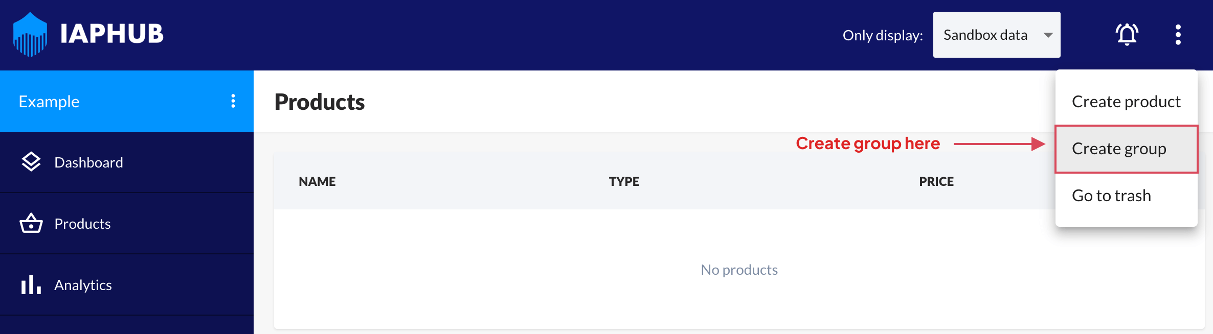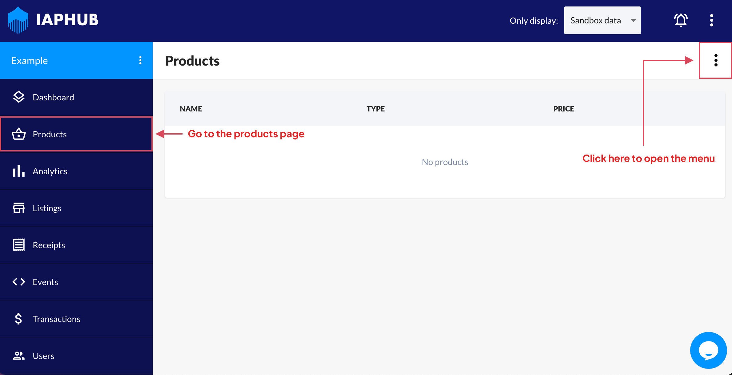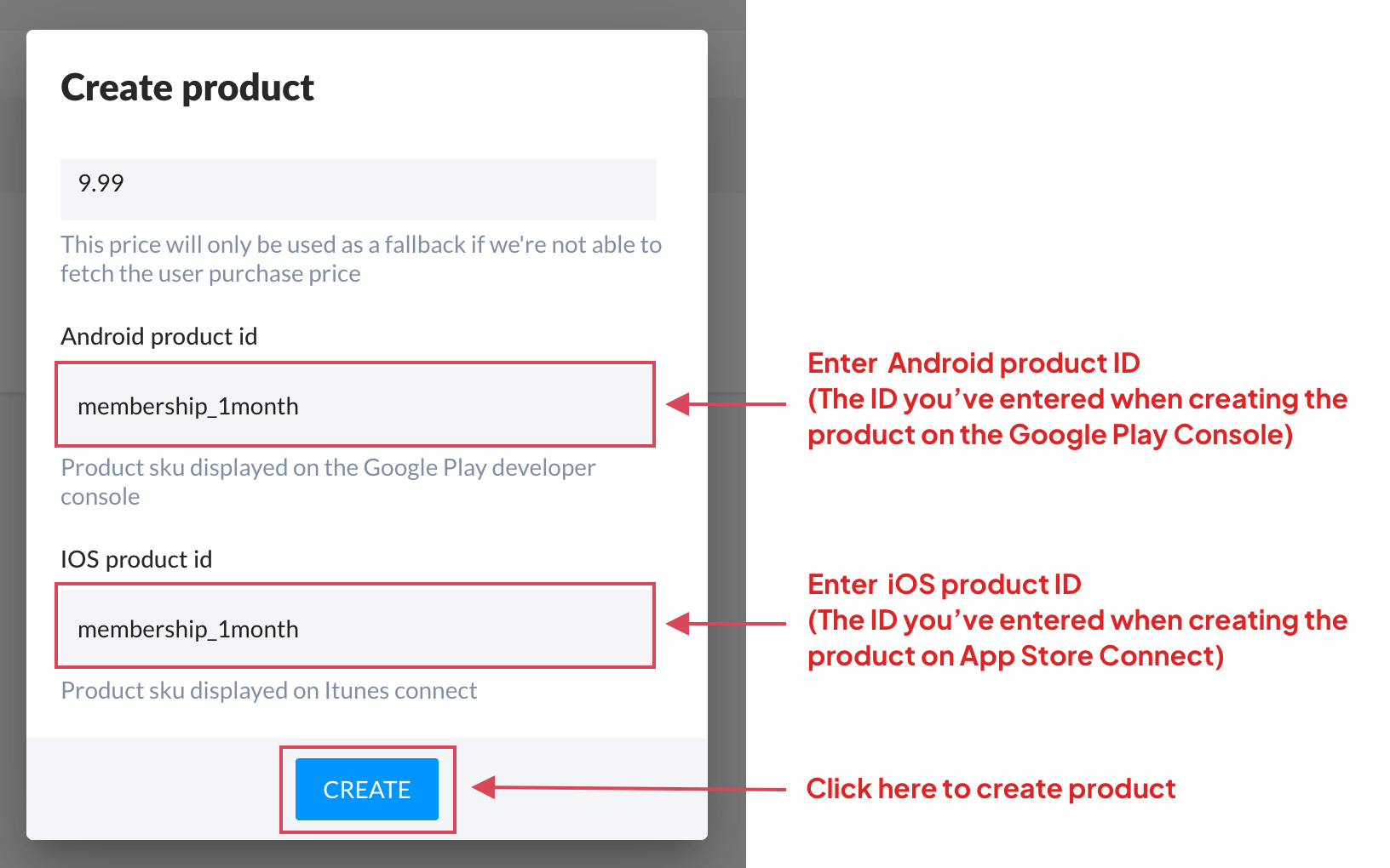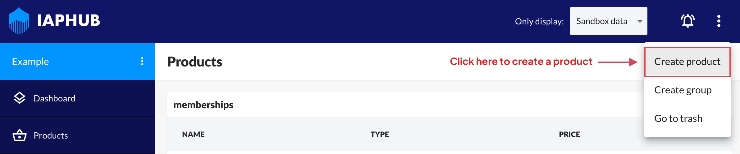 Every product you have for sale must be created on the IAPHUB dashboard, the Google Play Console (if you have an Android app) and App Store connect (if you have an iOS app).