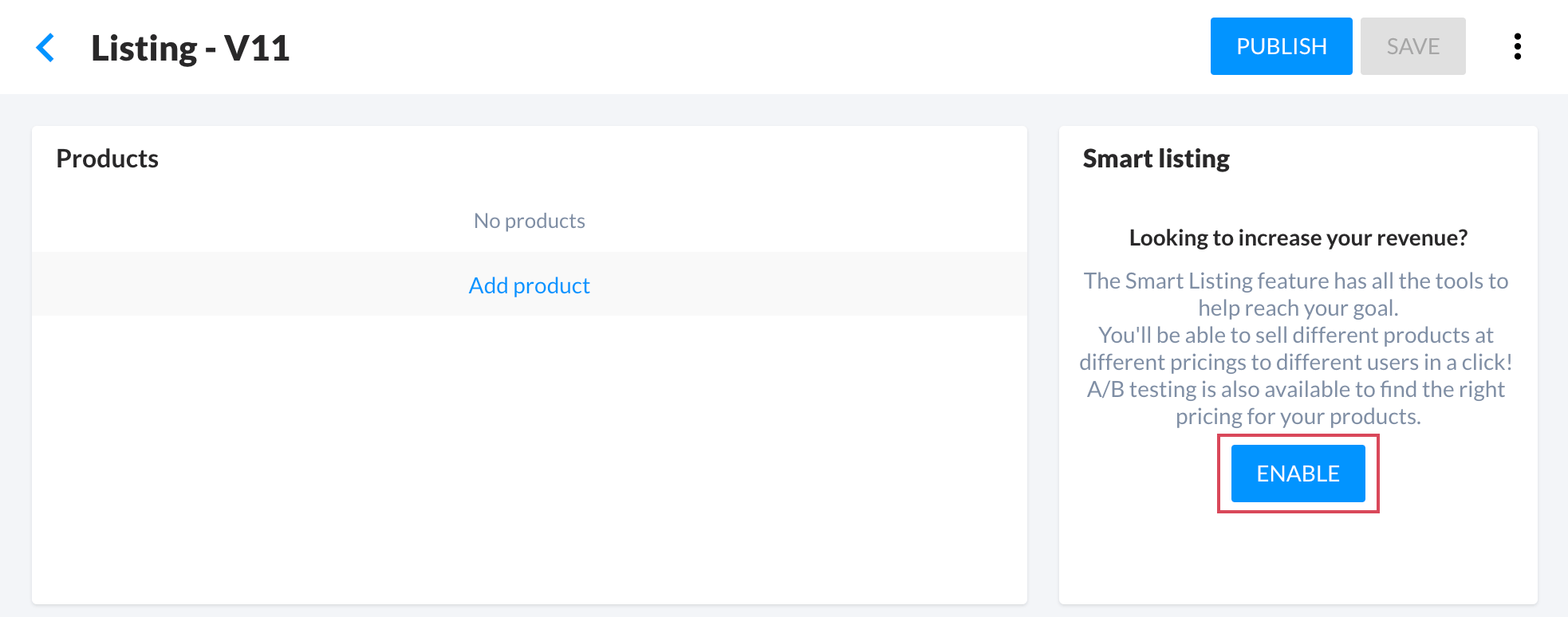 But fear not! With the Smart Listing feature, you can tailor product offerings to individual users. To activate the Smart Listing Editor, simply click on the Enable button on your latest listing (refer to the screenshot below).