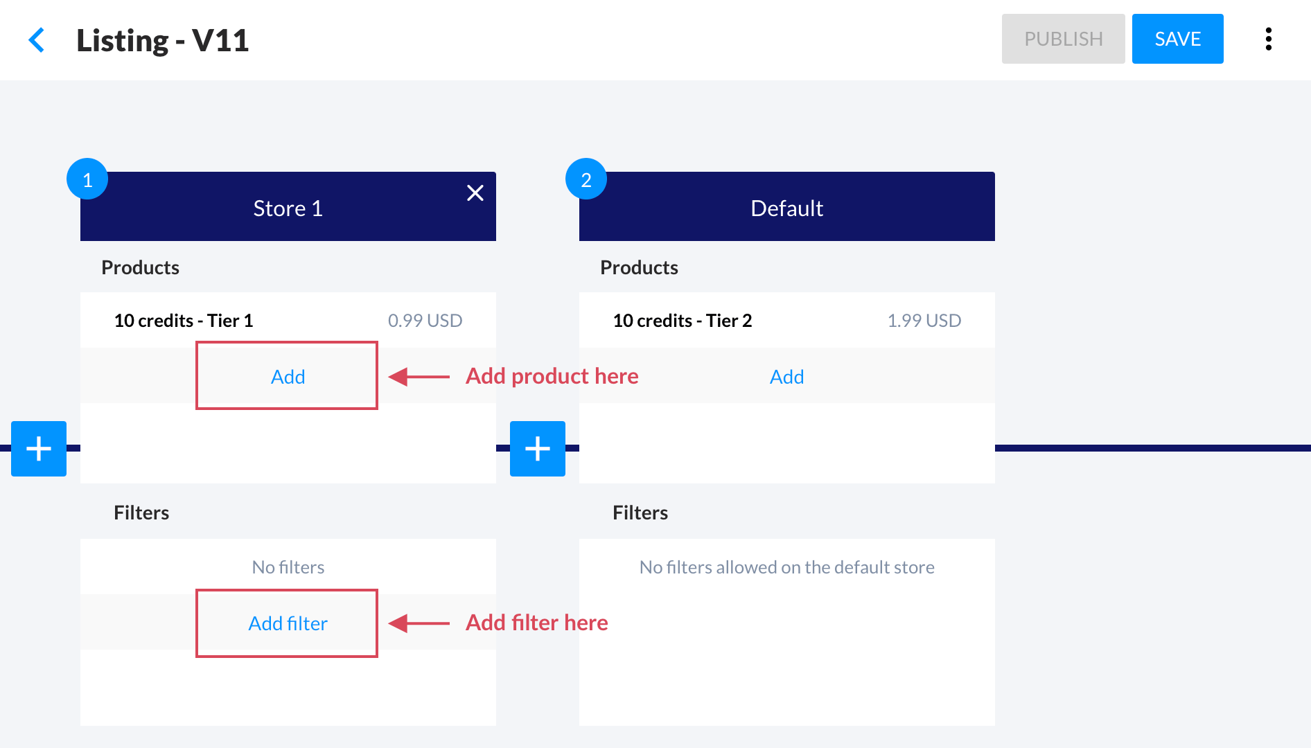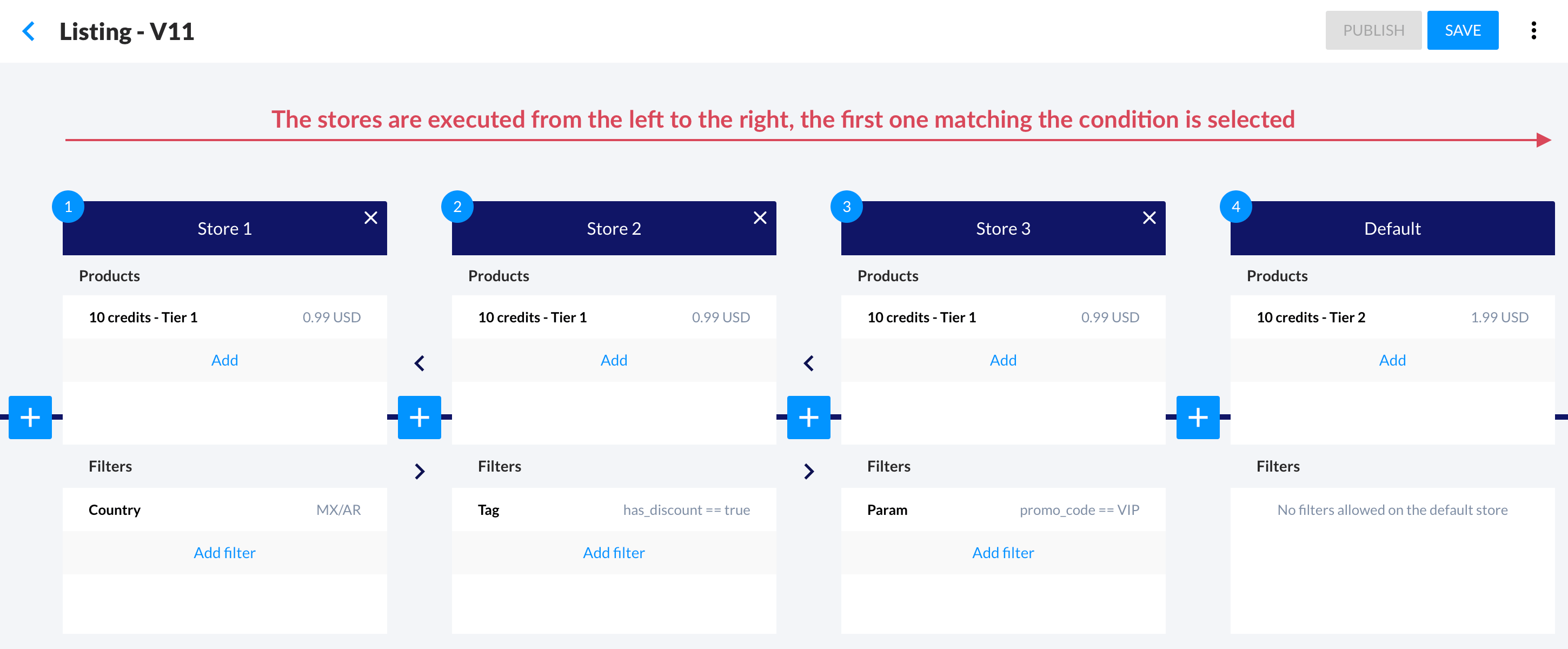 - Store: A store encapsulates a list of products. While a basic listing contains only one store, a smart listing can have multiple stores. Depending on our setup, IAPHUB determines which store to present to the user.