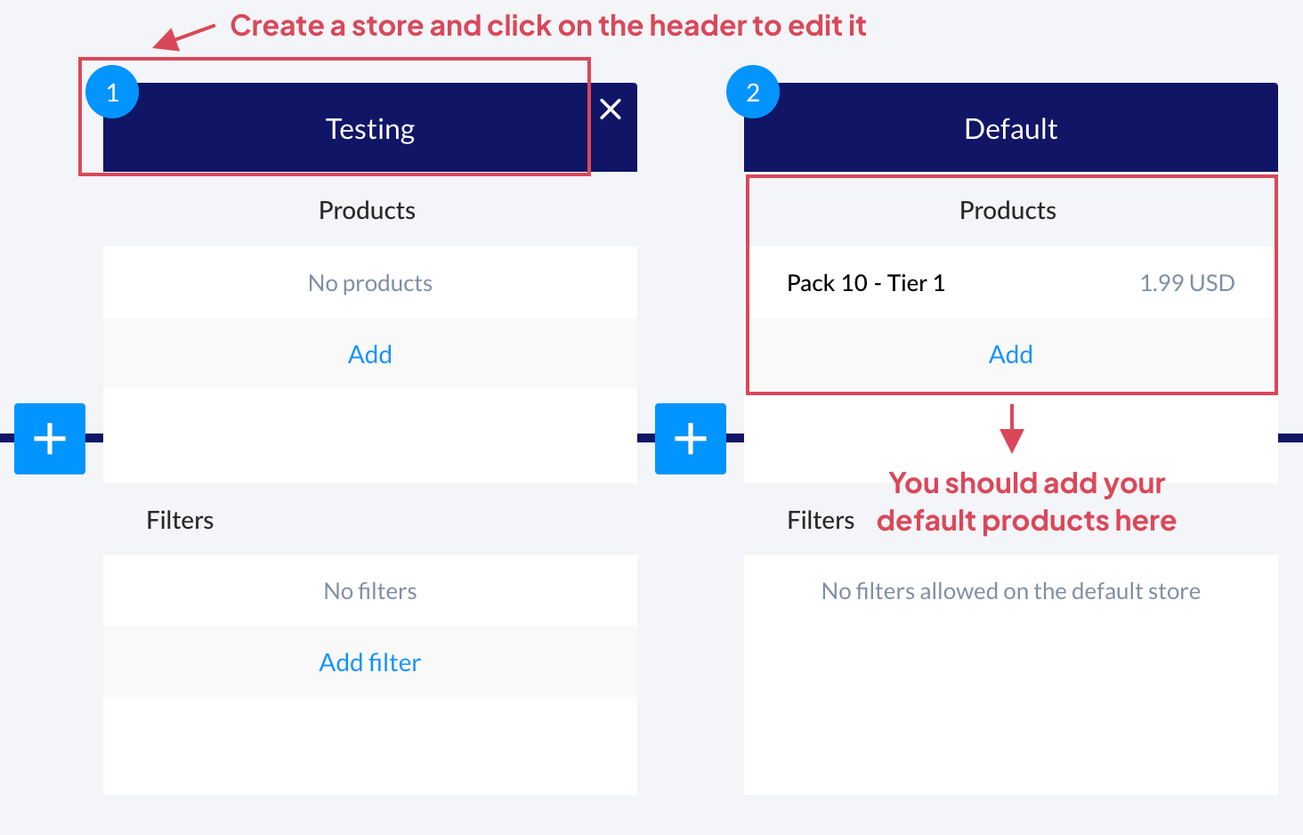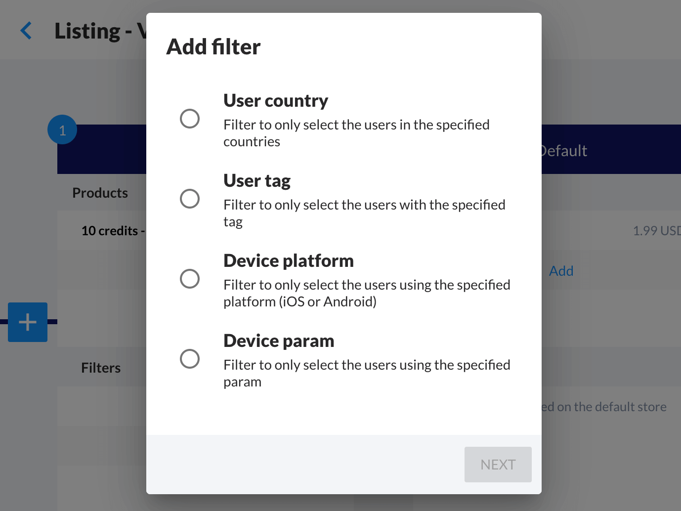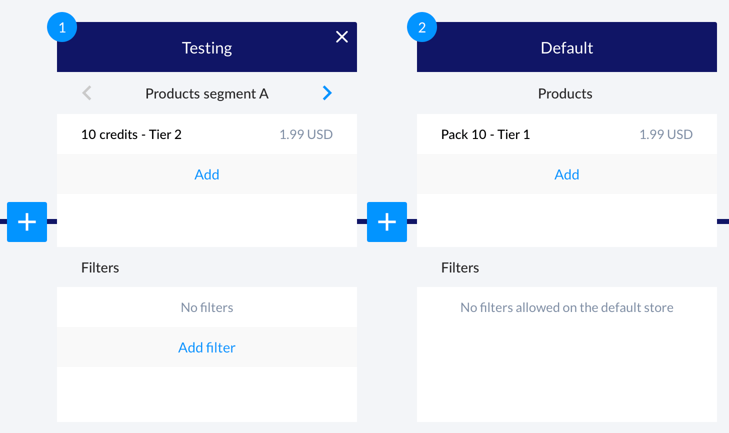 To inform IAPHUB that we're only returning Store 1 for select users, we need to add a filter. Simply click on the 'Add filter' link, and a modal will appear.