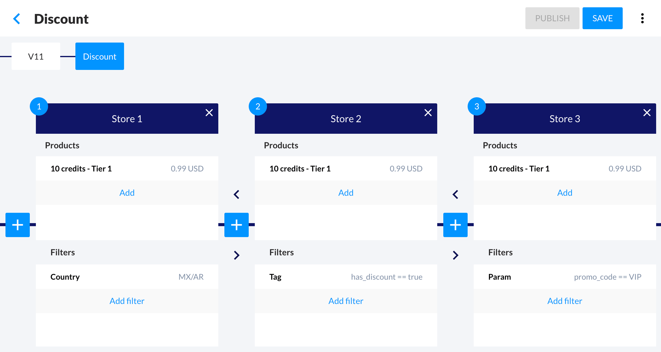 - Store 3 is executed: the system checks if a device parameter 'promo_code' with a value of 'VIP' has been provided. If so, the store is returned.