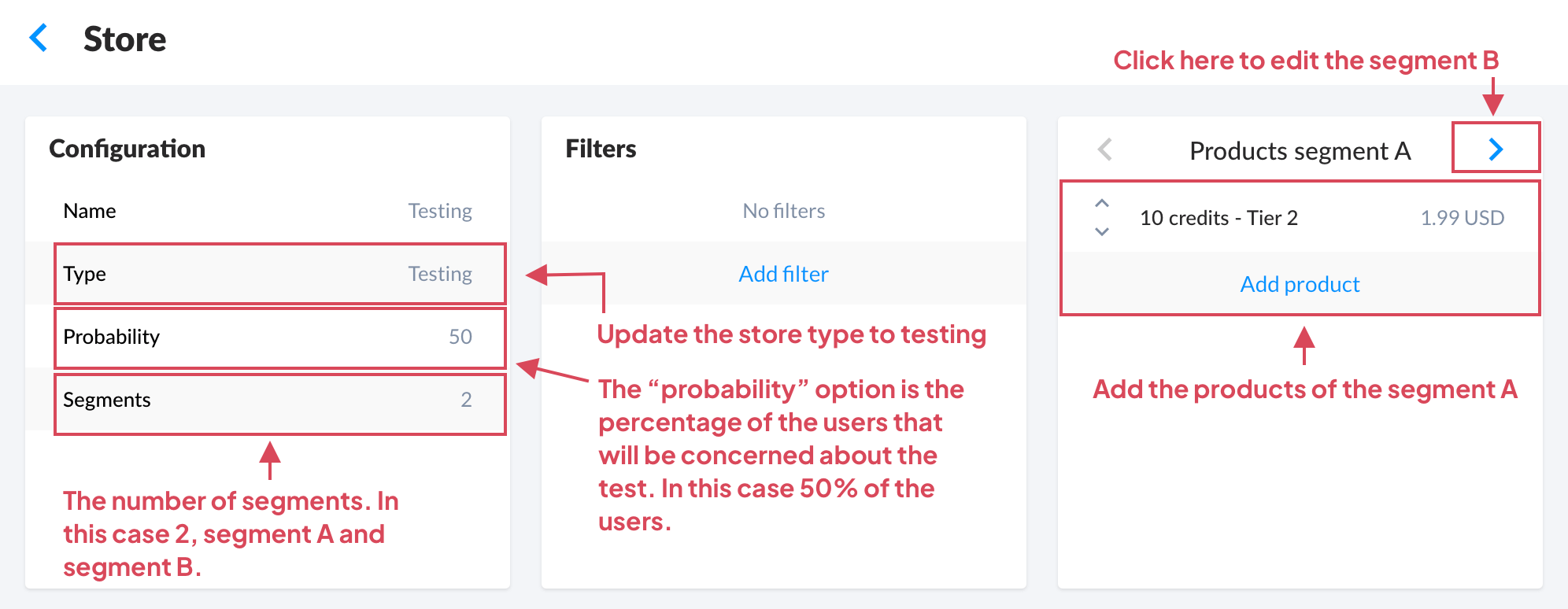In the example below, we've set up an A/B test featuring two products: "10 credits Tier 1" and "10 credits Tier 2".