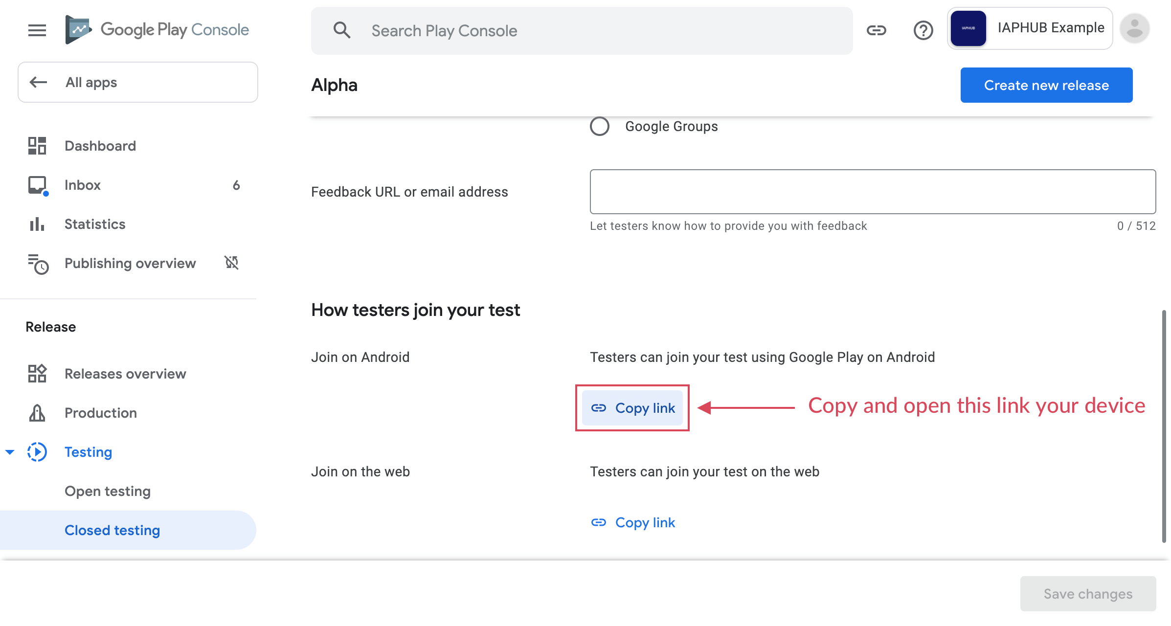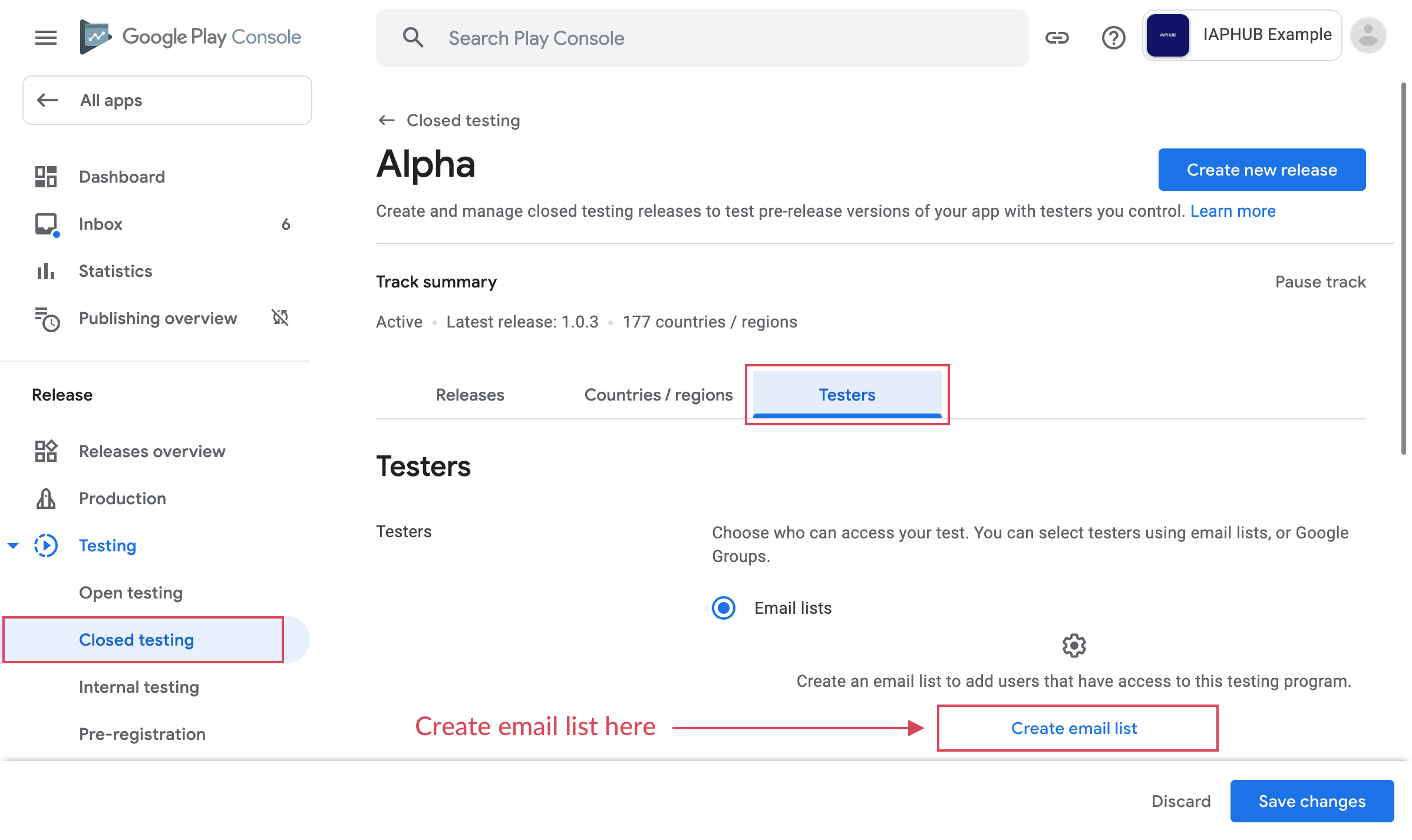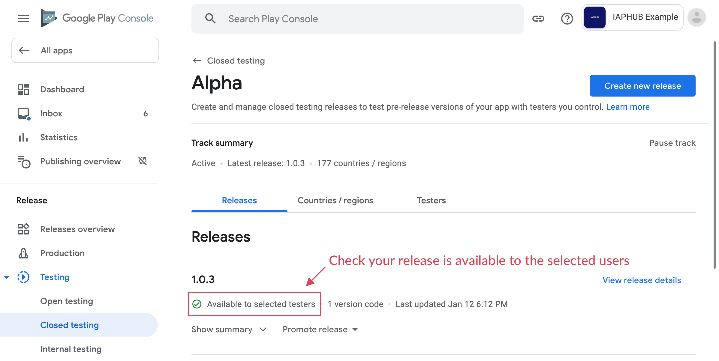 In the example below, we're publishing the app in a Closed Testing track, but it can also be published in the Internal Testing track.