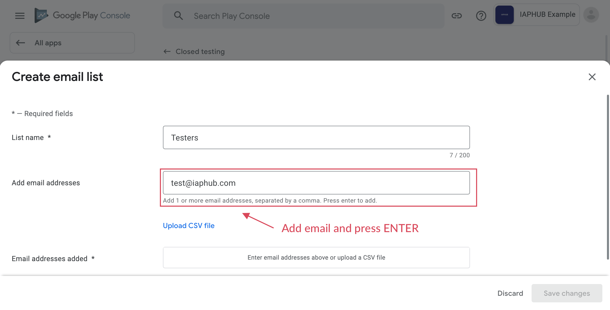 A modal will appear; add the email account of the phone you're using for testing and press ENTER.