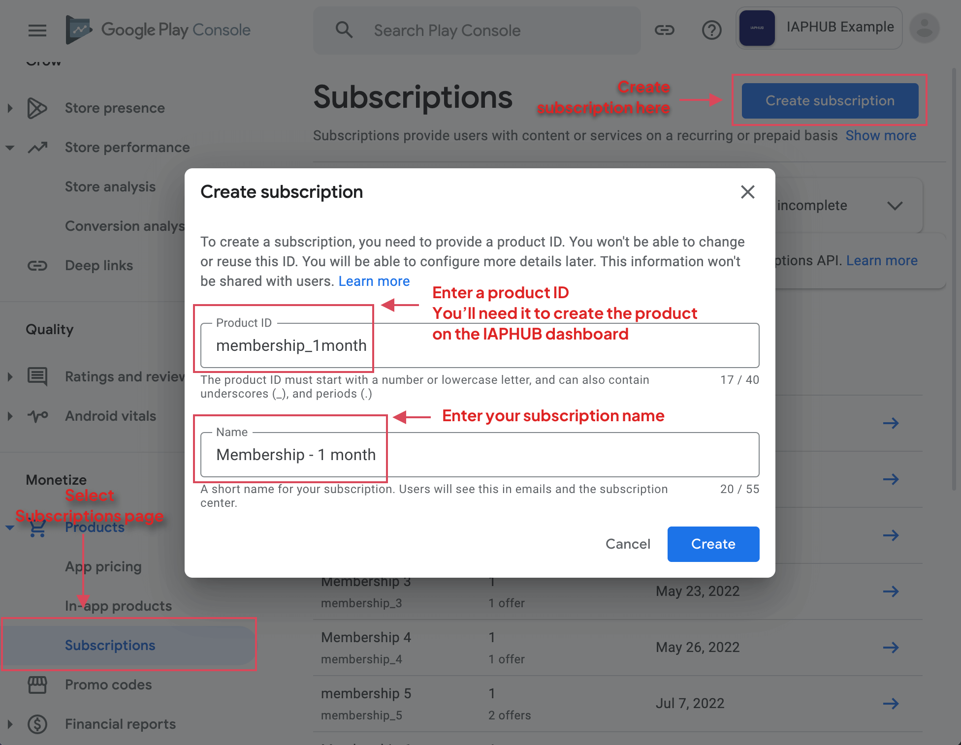 Enter a name and a product ID (you’ll need this id to create the product on the IAPHUB dashboard) and click on the Create button.