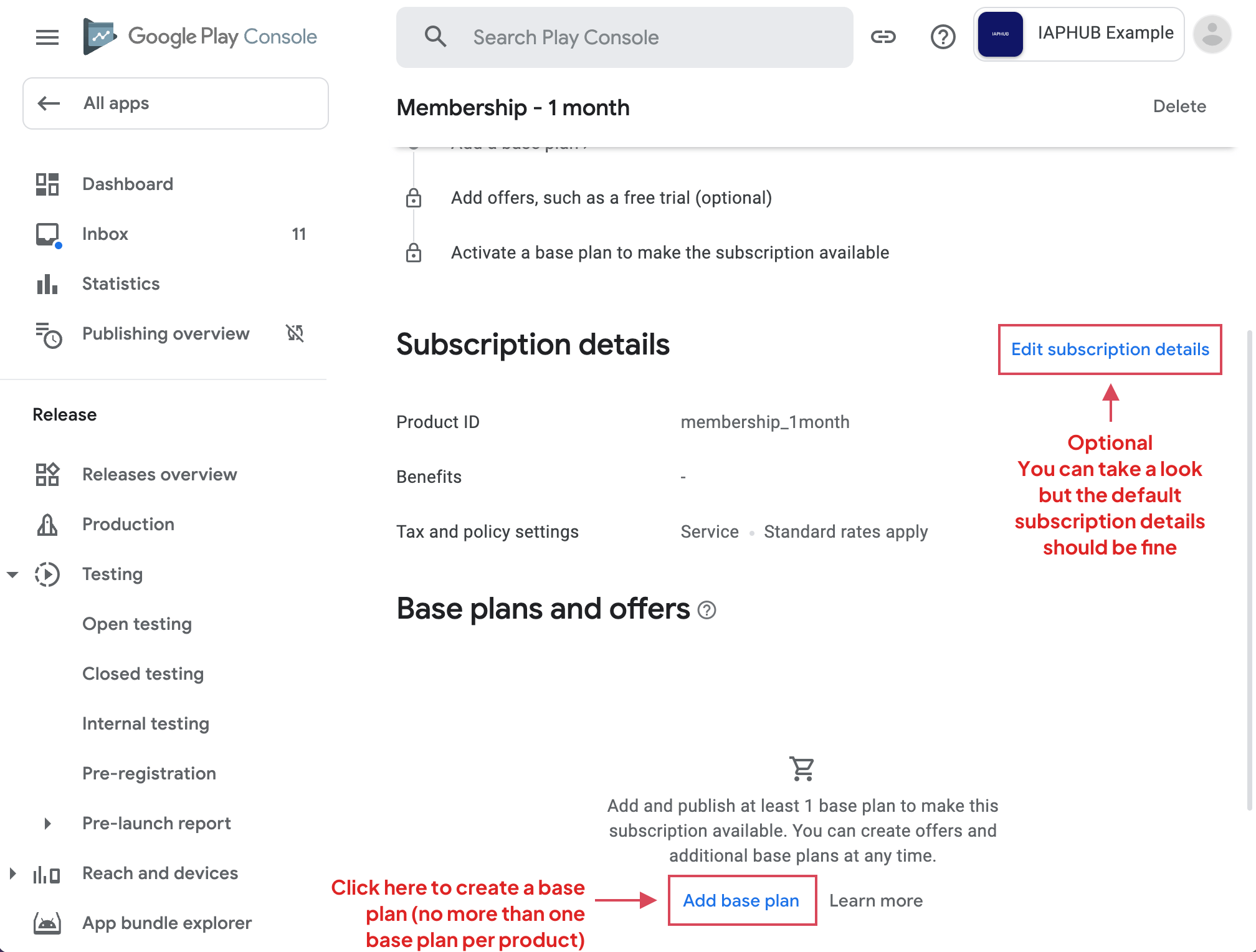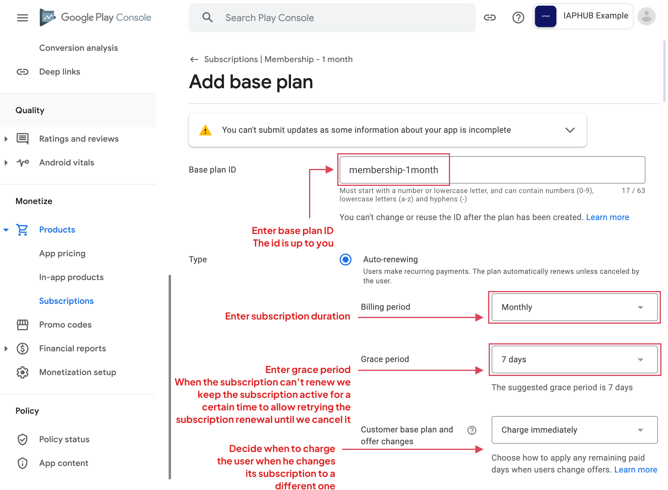 Enter a base plan ID (the format is up to you, this id isn't used by IAPHUB).