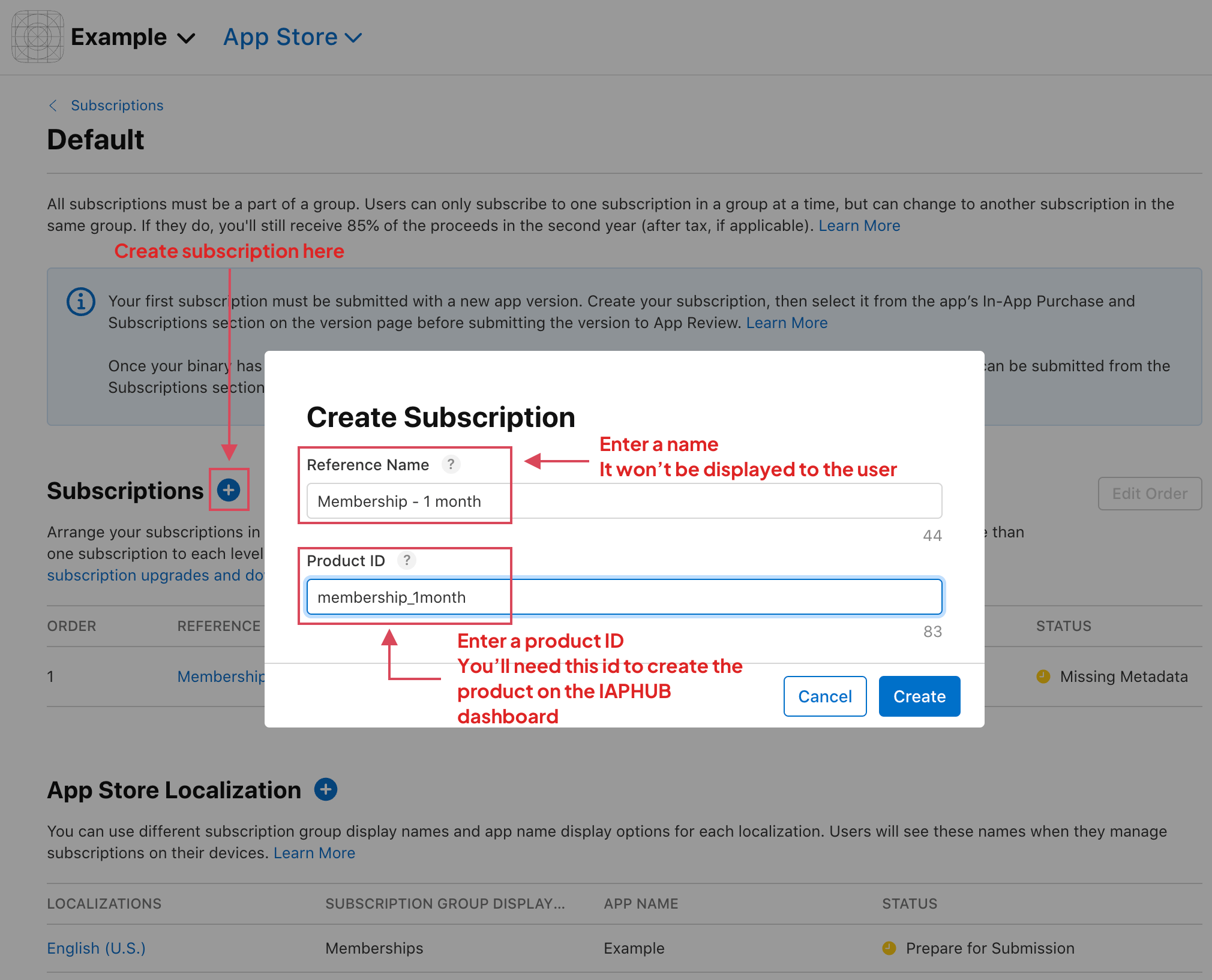 Select your app and go to the Subscriptions page. Every subscription needs a subscription group, if you dot have one click on the "+" icon to create one.