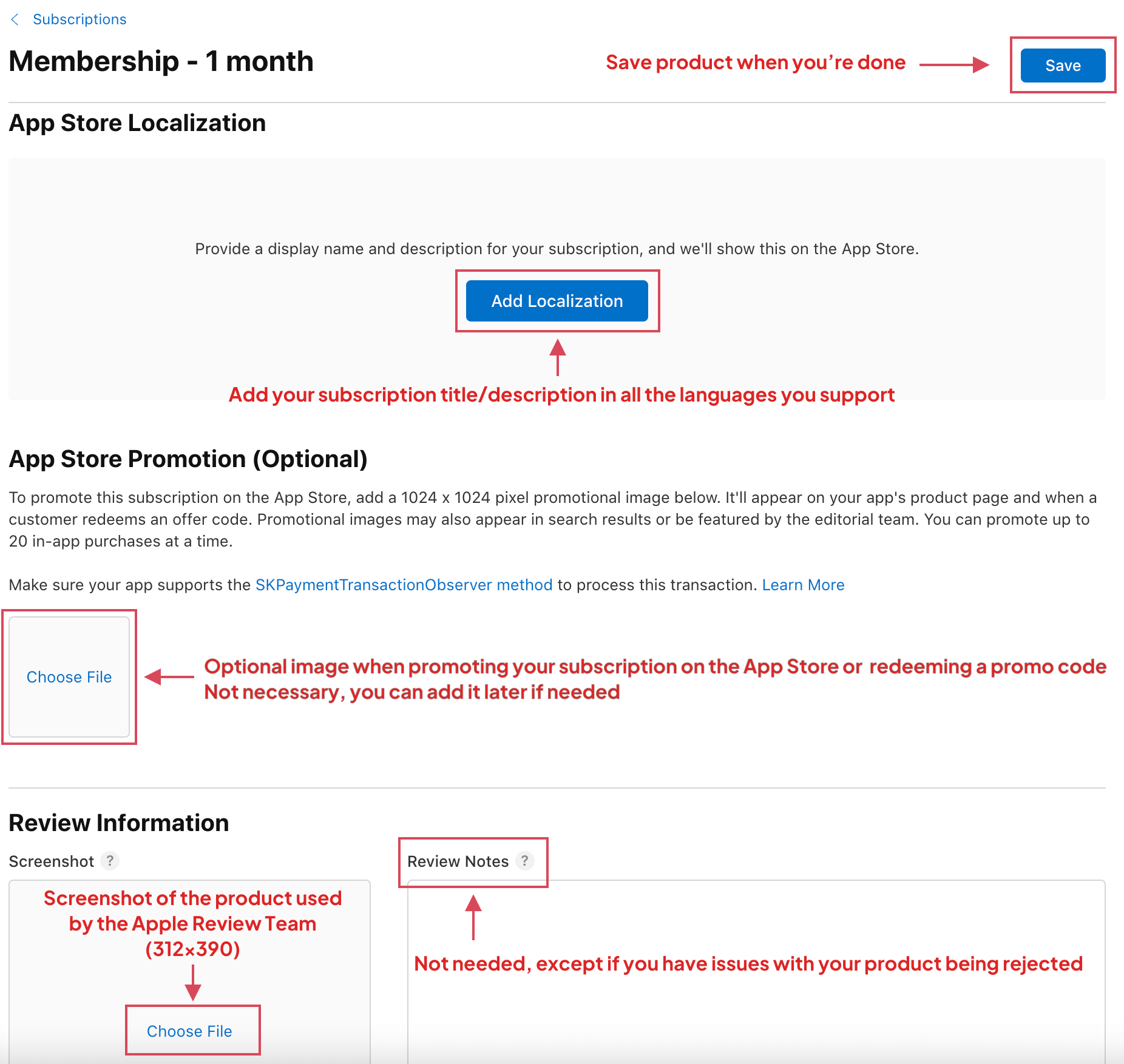 For the review information, simply add a basic image (312x390) with the name of your subscription. The review notes are not needed (except if you have issues with your product being rejected).