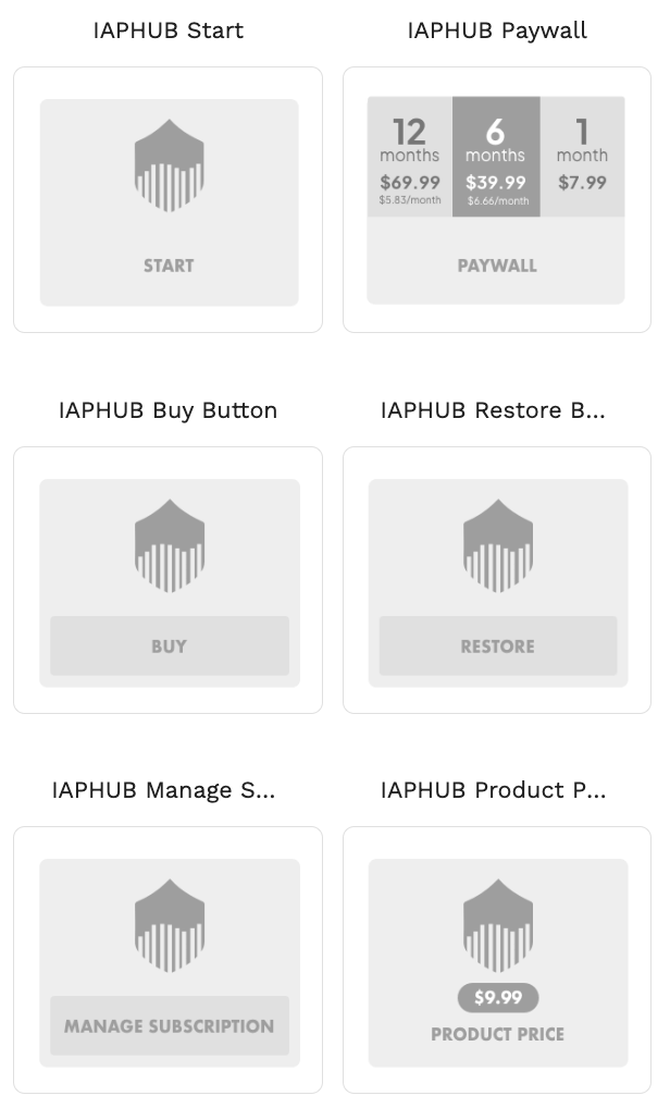 You should first install IAPHUB from the Adalo marketplace. After doing so, you'll be able to use the following components: