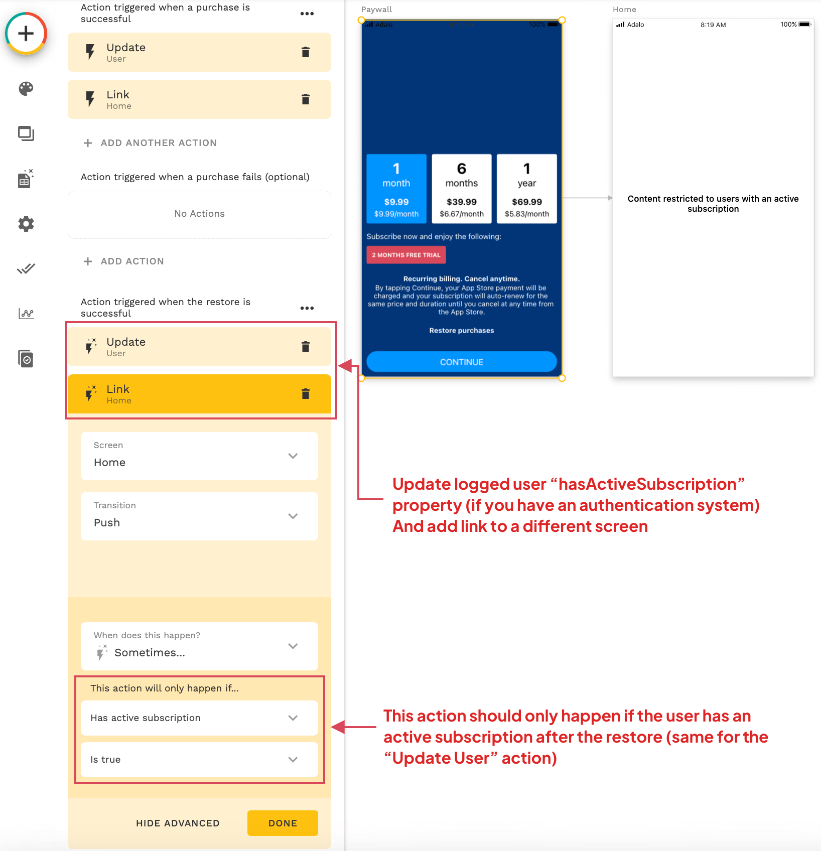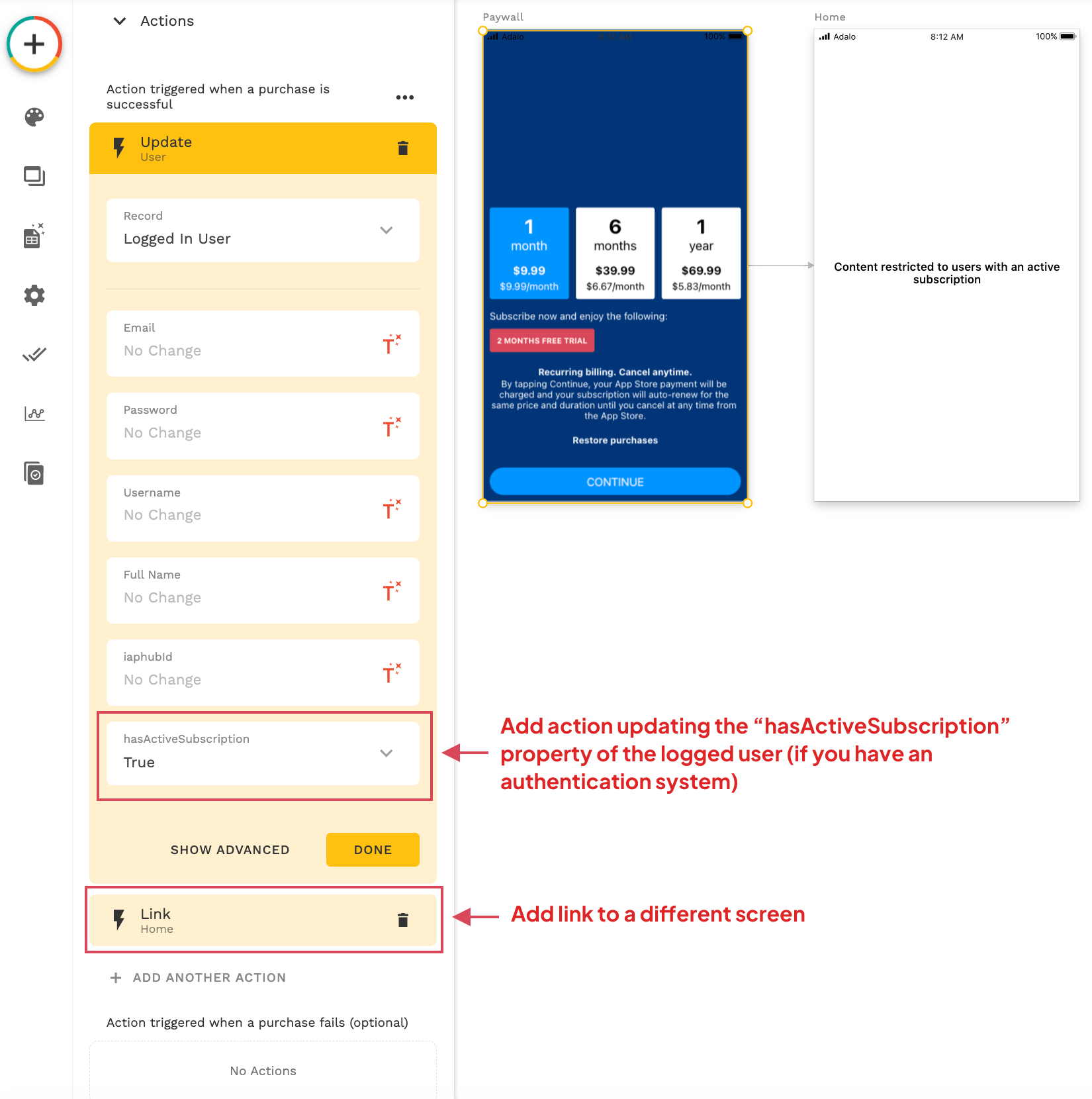 If your app has an authentication system and you've added a property hasActiveSubscription for the logged-in user, as explained in our guide, you should also add an action to update the property to "true".