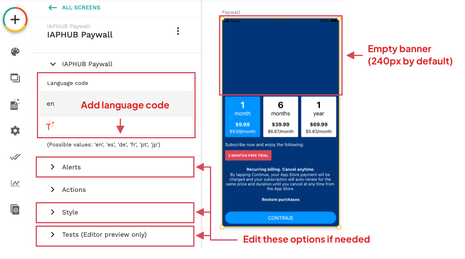 Once the background color is configured, you can proceed to insert the Paywall component. Simply provide the component with your language code. It's crucial to ensure that the component spans the entire screen's height and width for seamless integration. By default, the component includes an empty banner with a height of 240px. This banner offers customization options such as adding a title, description about your subscription, or an image. Adjustments to the banner height can be made in the Style menu to suit your preferences.