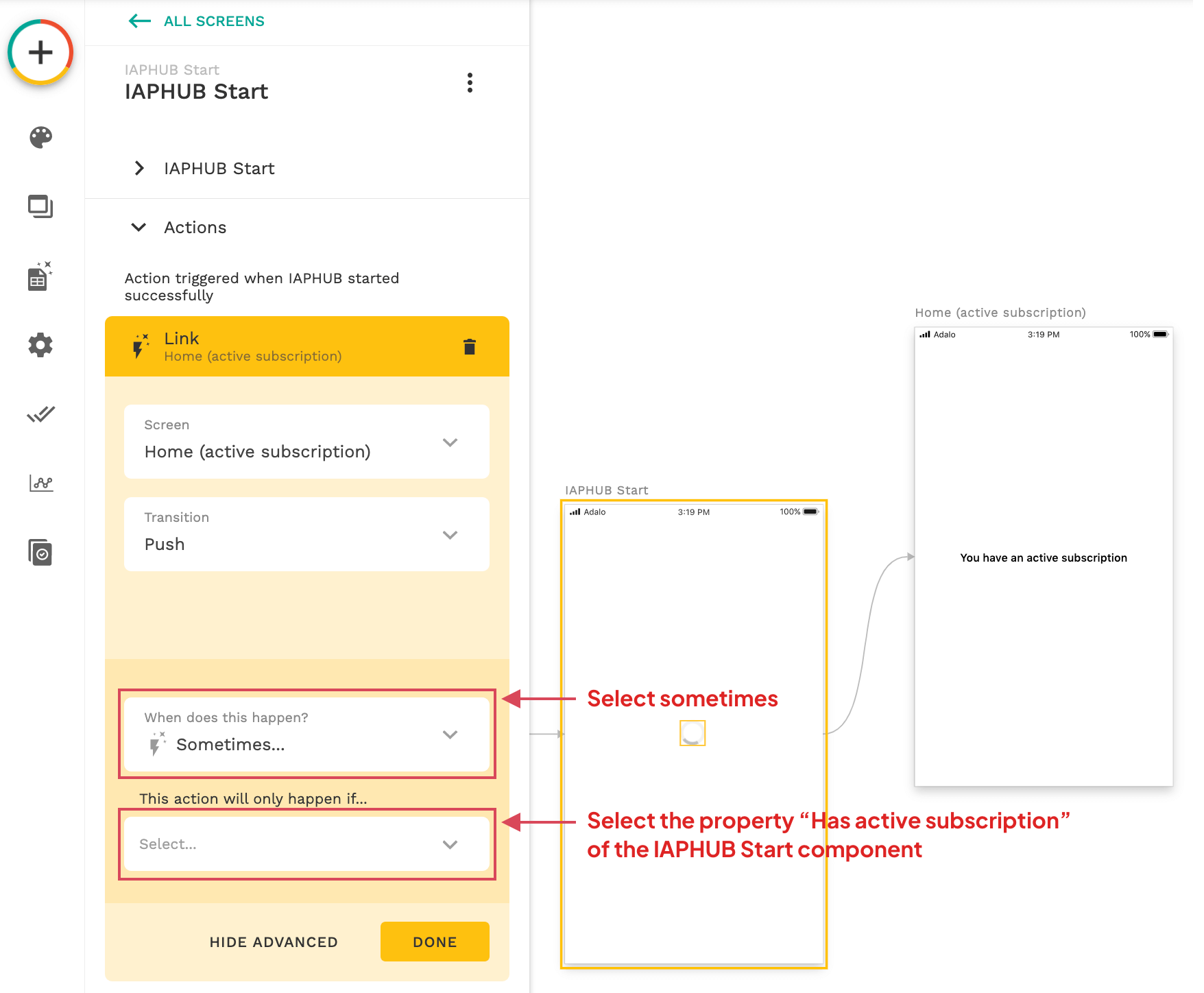 If needed you can also redirect the user to a different screen depending if the subscription is active or not (no authentication system needed). To do so click on the "When does it happen?" option when you create a link. Click on "Sometimes.." and select the property "Has active subscription" of the IAPHUB Start component.