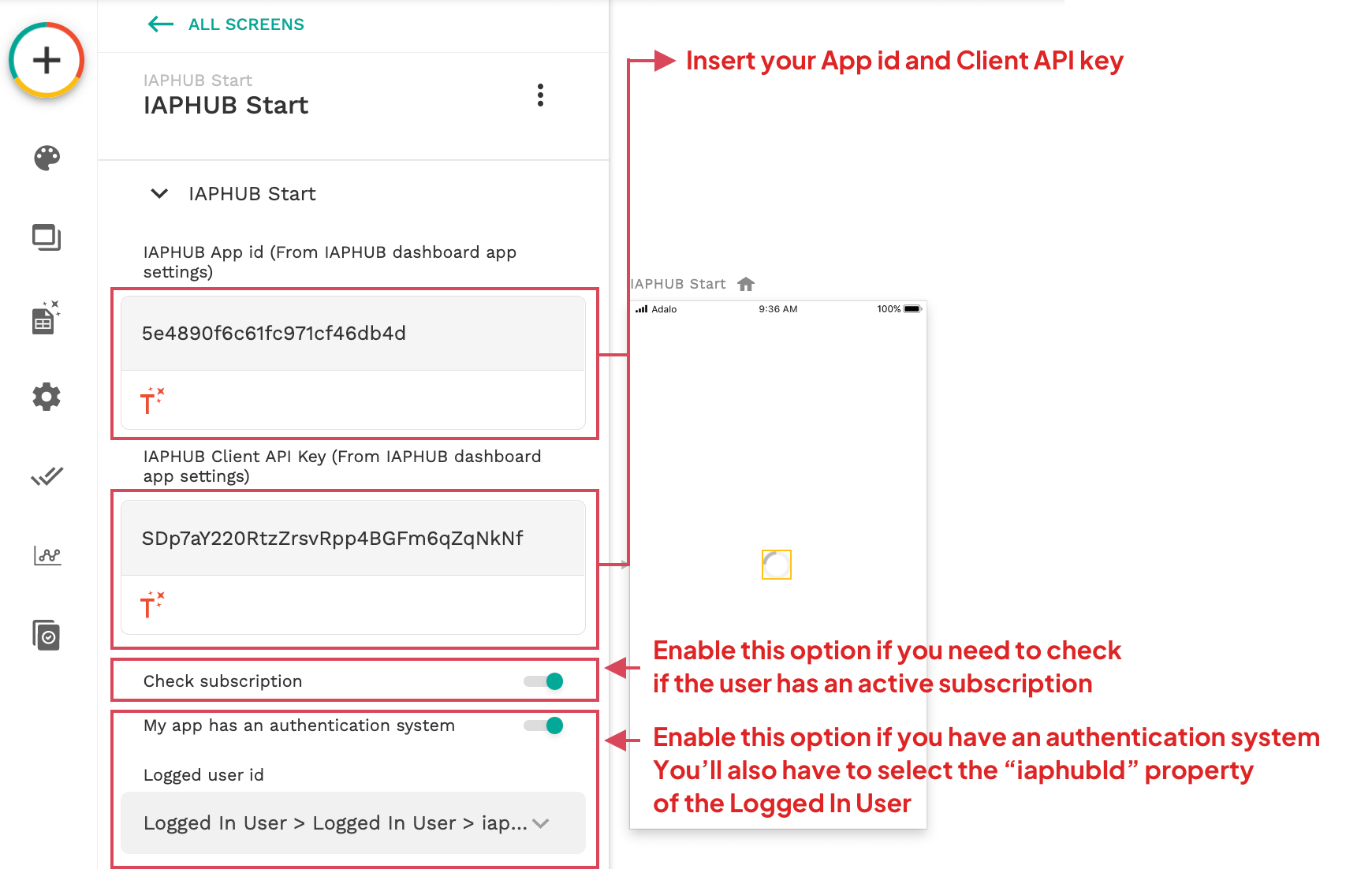 Configure the component by entering your App id and Client API key. The App id and API key are available on the settings page of the IAPHUB dashboard, please make sure to use the client API Key. The server API key should only be used for our server API.