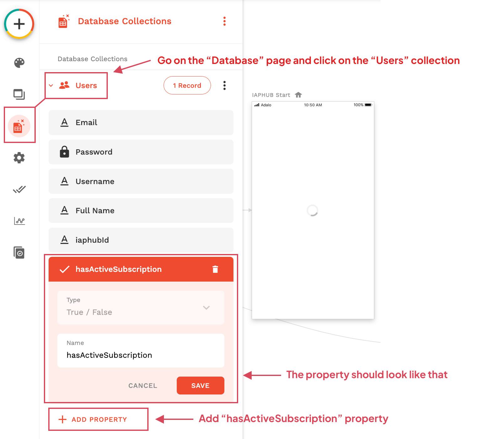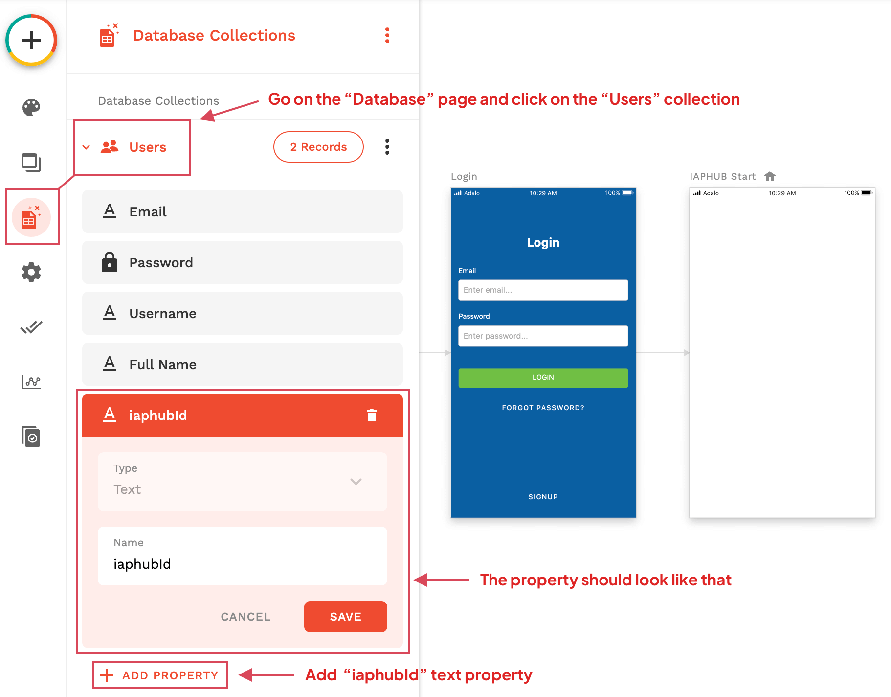 Go to the Database page, click on the Users collection and add a text property iaphubId.