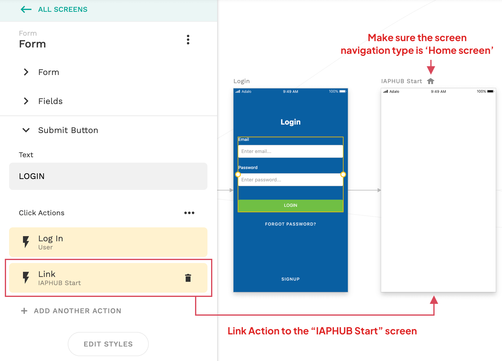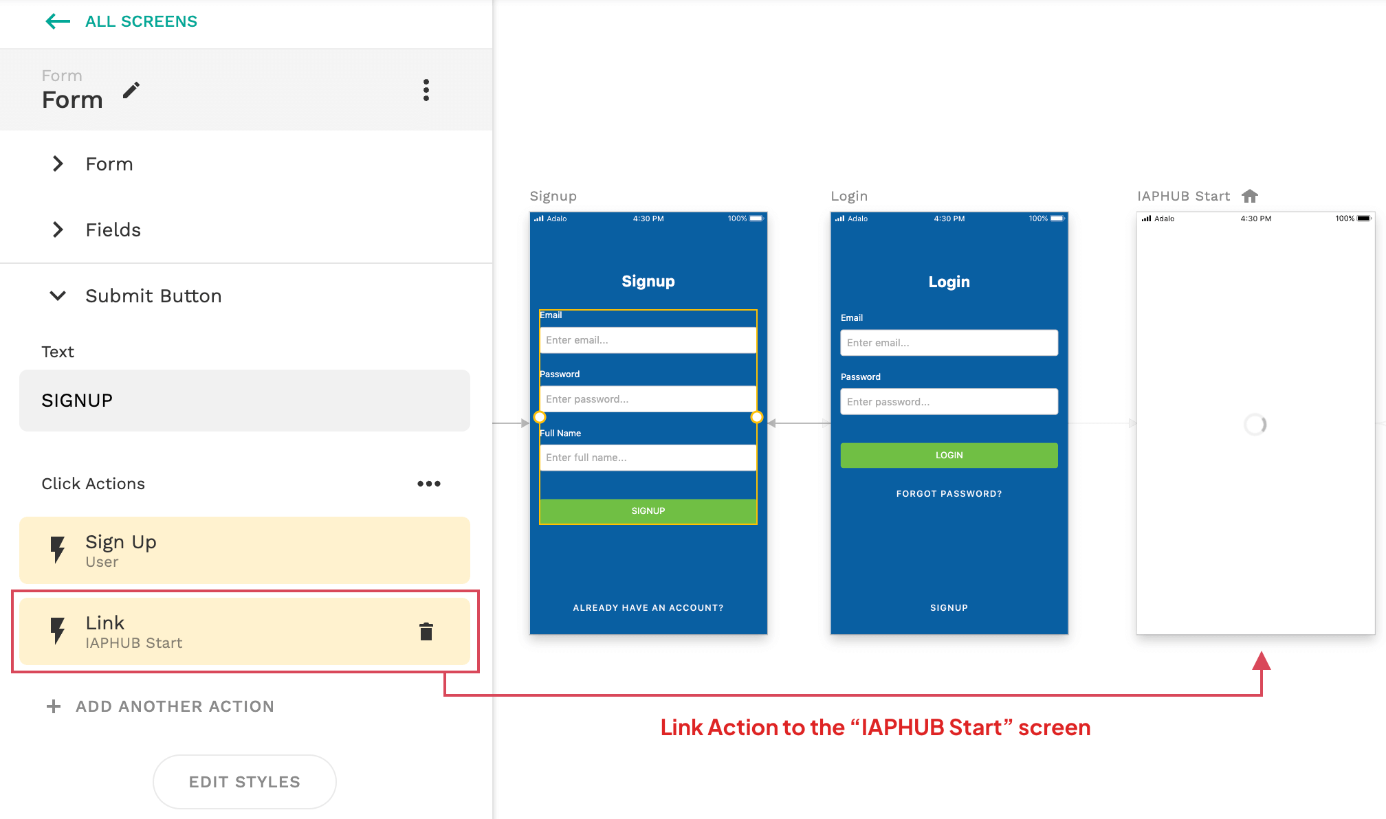You should also do the same for the form of your signup screen. Add a link action that will redirect the user to the "IAPHUB start" screen when the user is registered.