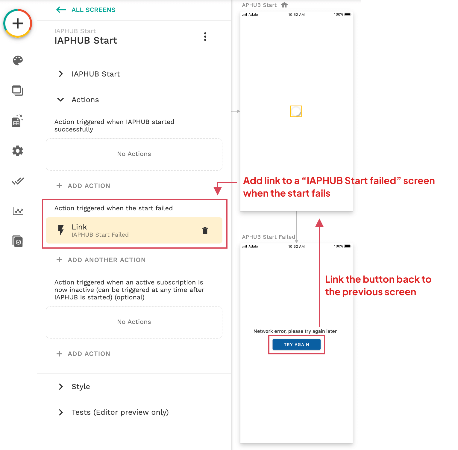 This action will be executed after IAPHUB is started. You should link this action to the next screen of your app.