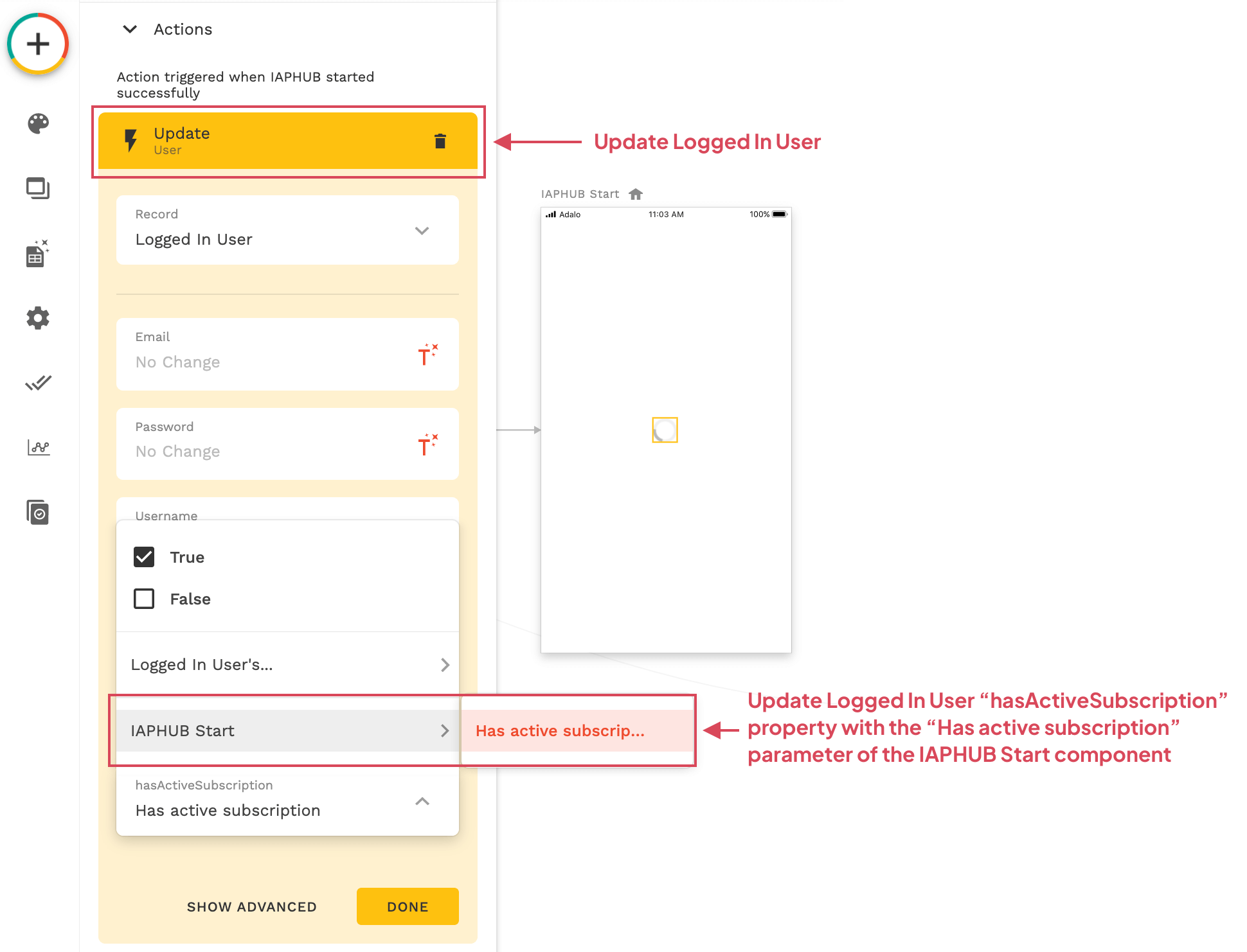 After that you'll just have to add an action and update the Logged In User hasActiveSubscription property with the Has active subscription parameter of the IAPHUB Start component.