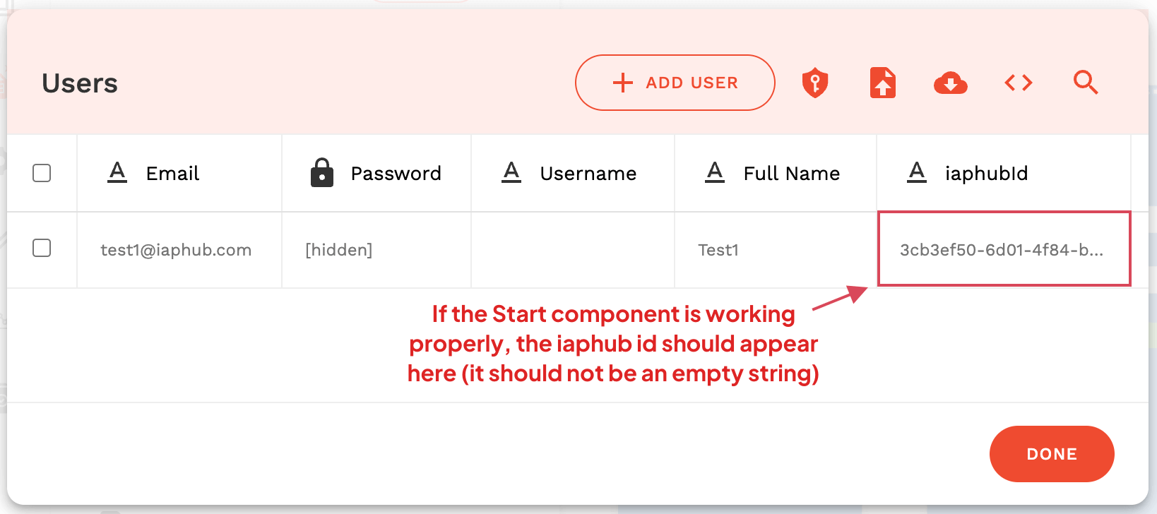 In order to do so simply go to the Database page of the Adalo dashboard, click on the Users collection and click on "X Record". If everything is configured correctly you should see an id in the record of the user.